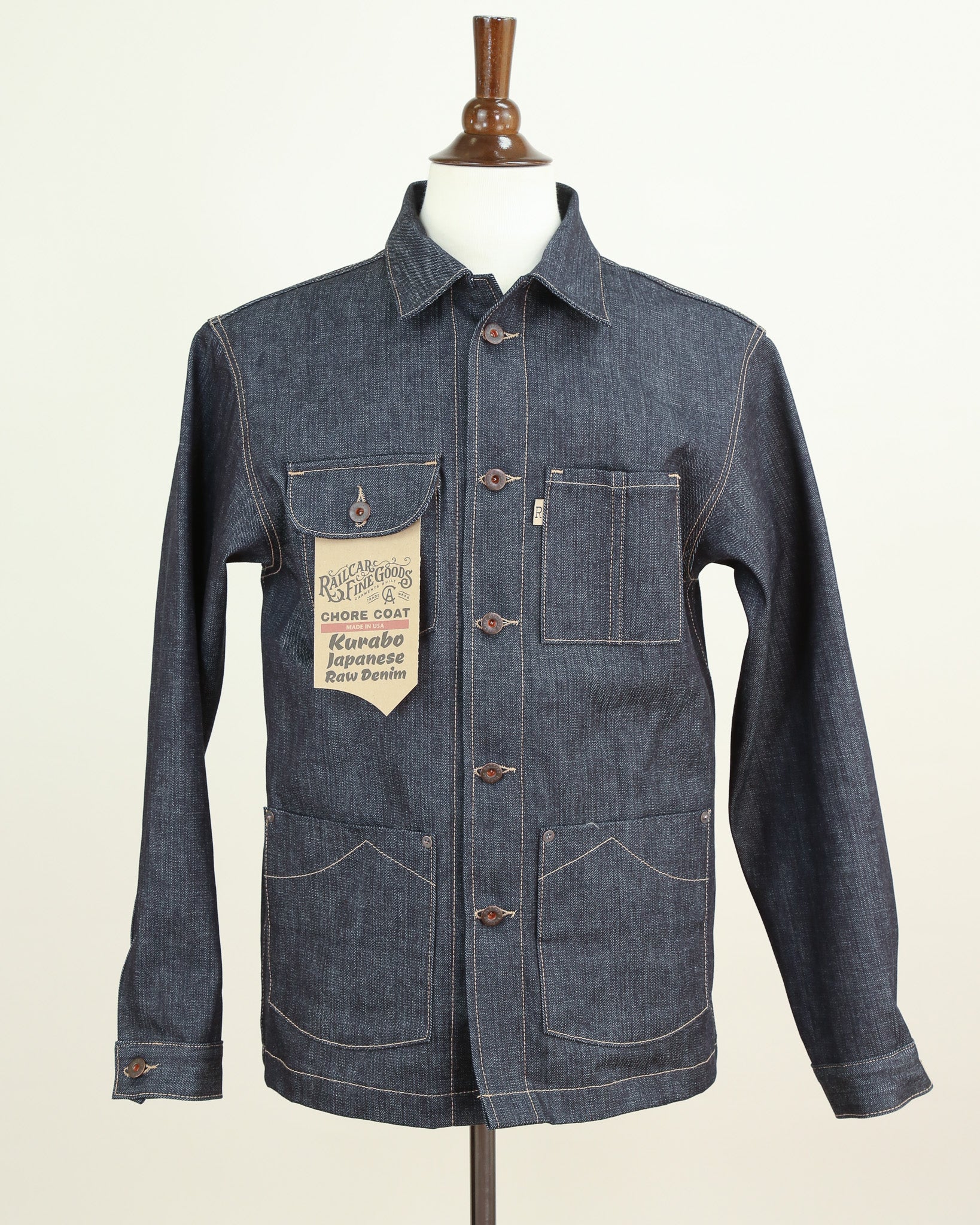 The Railcar Chore Coat is a perfect year round garment. The coats are cut and sewn in the Railcar workshop in California out of a Japanese Kurabo 11.5 ounce slubby raw denim. The denim feels like a light weight when new and raw but will thicken up to a medium weight. This coat will rapidly evolve and fade to a new patina look as you wear it. The coat is trimmed with American woven labels, thread and hardware. The coat features a classic Americana style with Railcar's signature modern fit and finish. Flat felled seam construction for durability and shell edge interior stitching complete the details.
