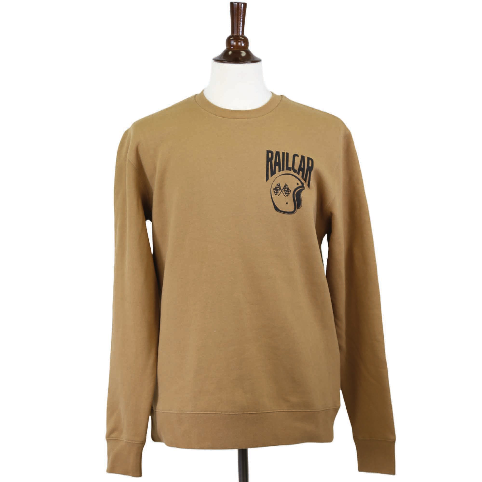 Railcar Helmet Race Division artist graphic 10 ounce camel color premium crew neck sweater. Screen printed in-house