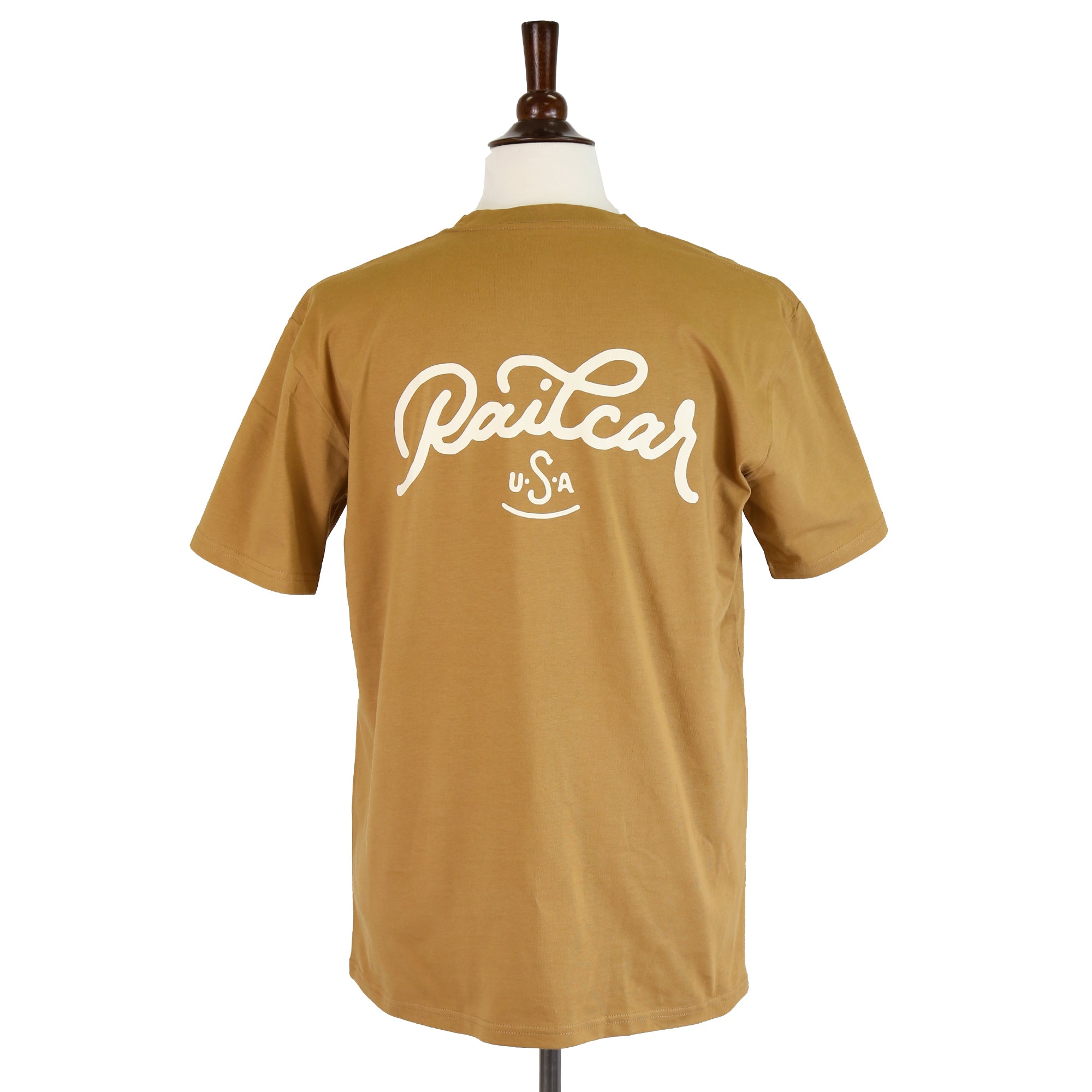 Railcar USA Script shirt 6.4 ounce khaki color premium tee shirt. Screen printed in-house