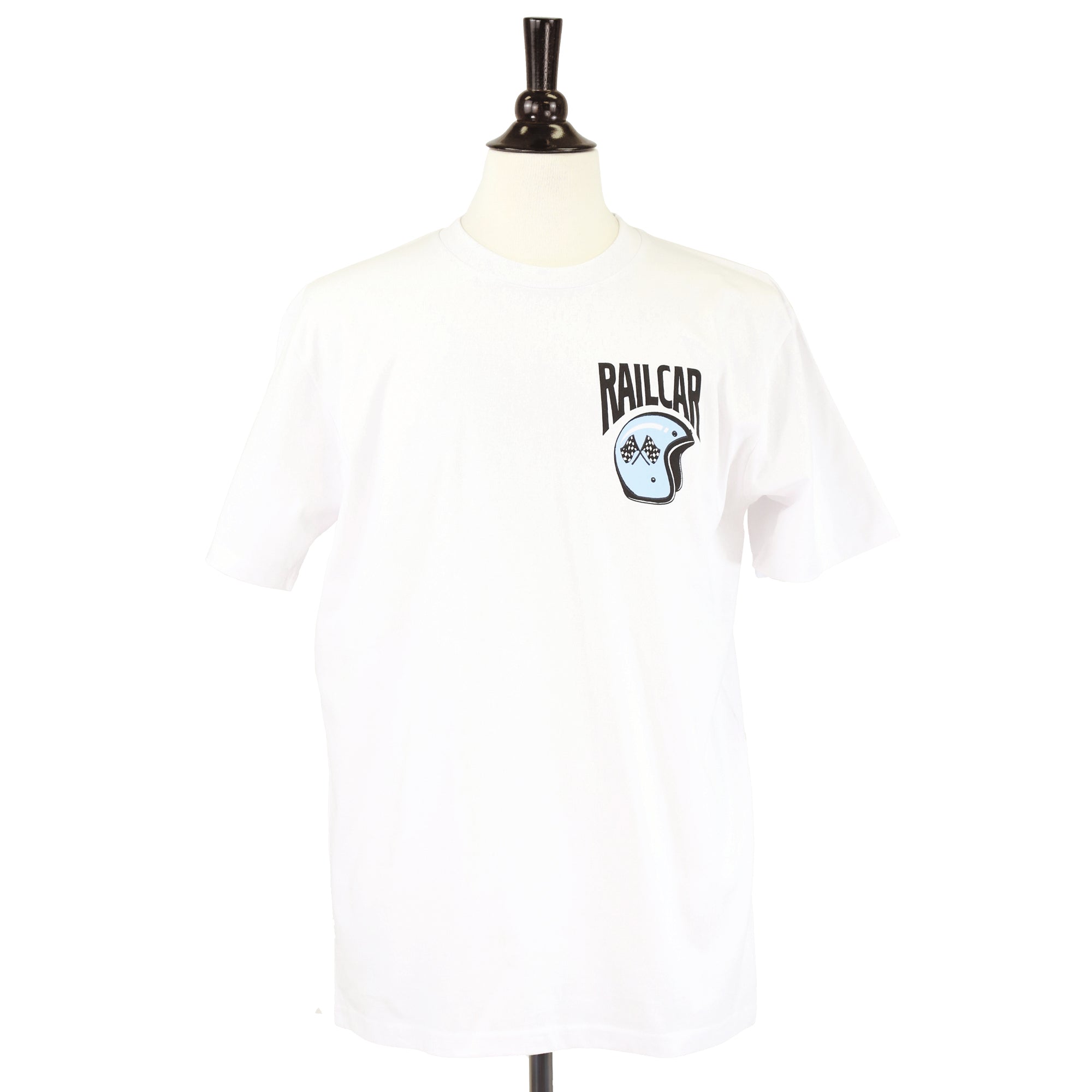 Railcar Helmet Race Division artist graphic 6.4 ounce white color premium tee shirt. Screen printed in-house