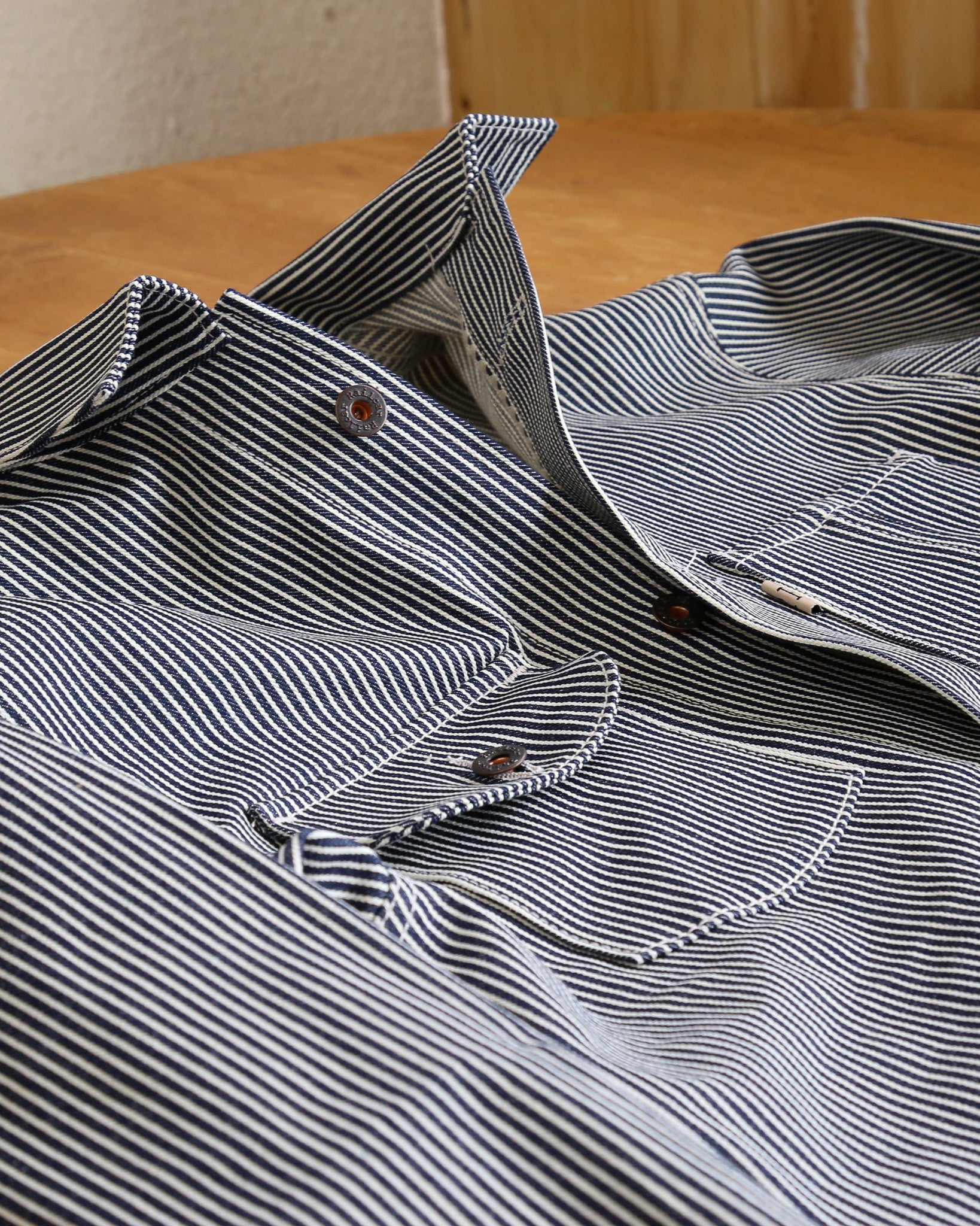 The Railcar Chore Coat made of the D005 Cone Mills Hickory is crafted from 12 oz stripped indigo, natural white stretch denim. A year-round weight that's solid and substantial, yet surprisingly soft on for comfortable daily wear.