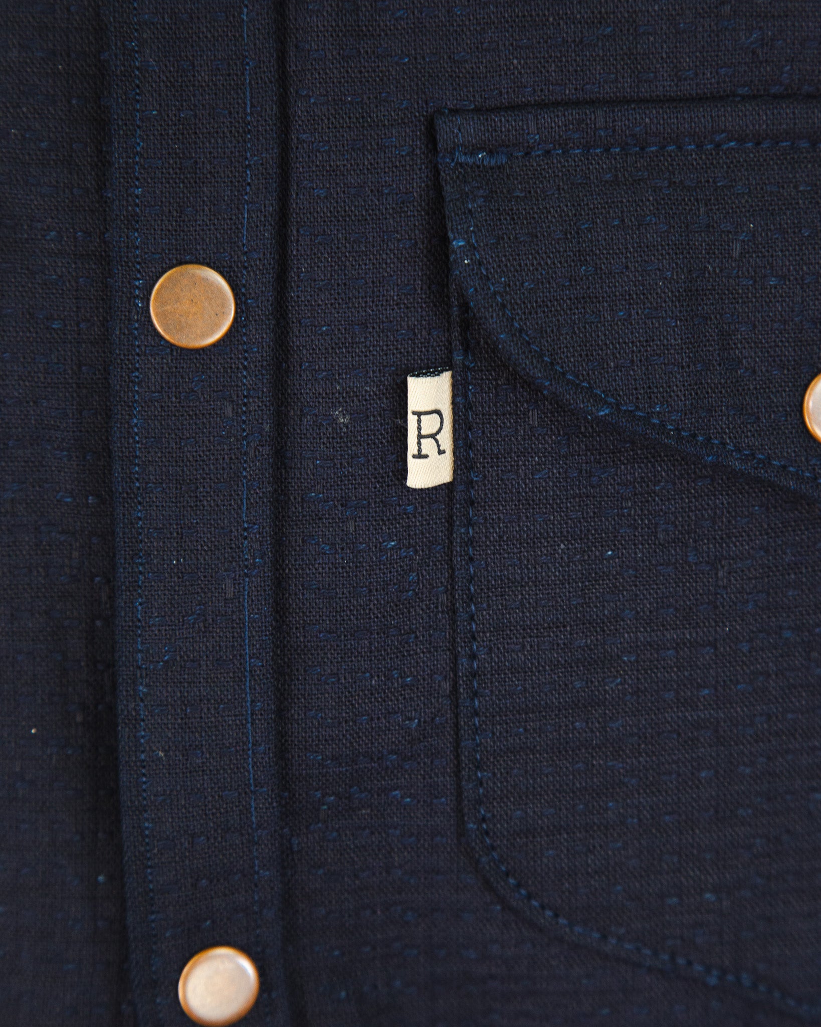- Dark indigo unshin sashiko style denim.